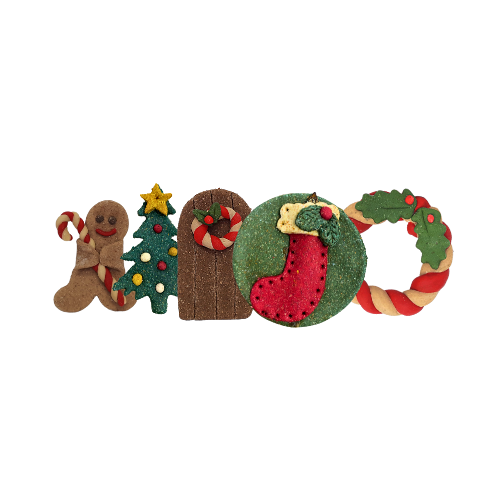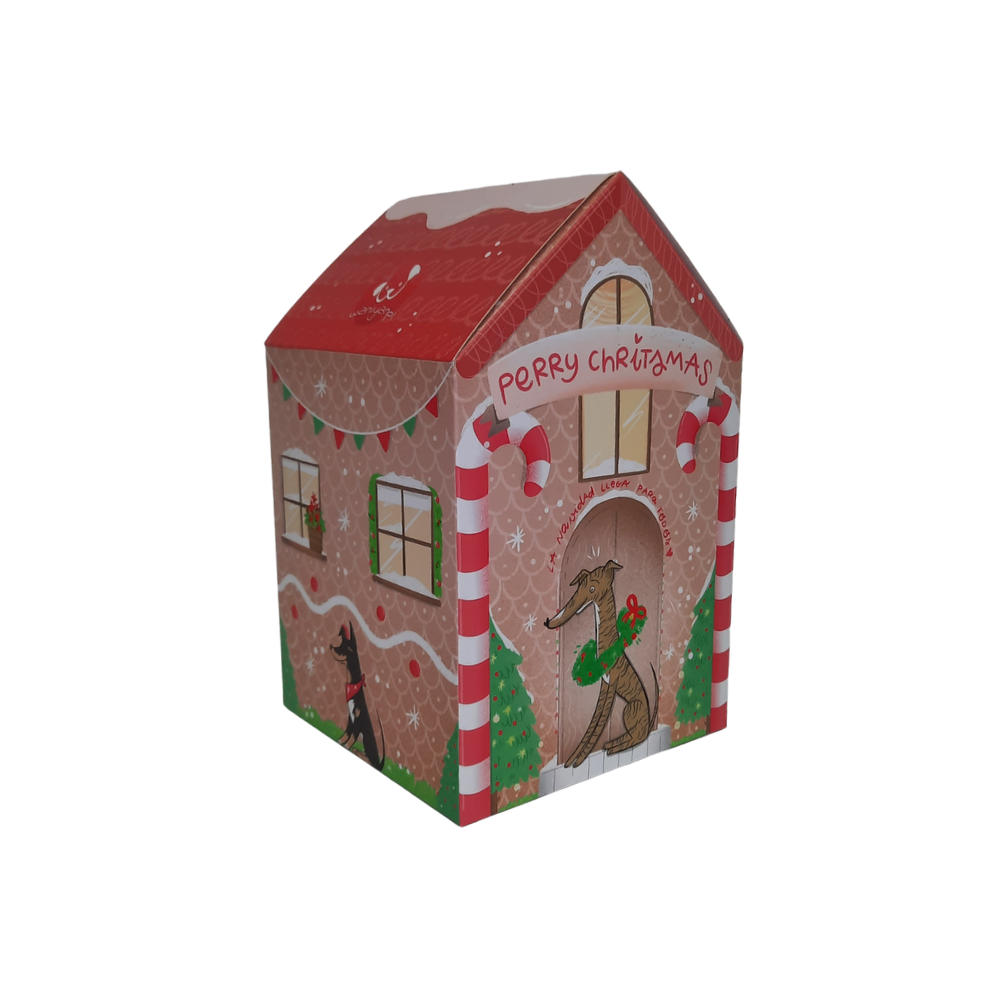 Casa de Navidad Perry Christmas, nuestra Box encantadora en forma de casa Con 5 grandes snacks estupendos para perros y gatos, hechos a mano y totalmente naturales en su interior .